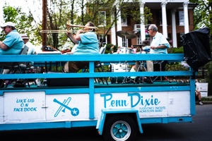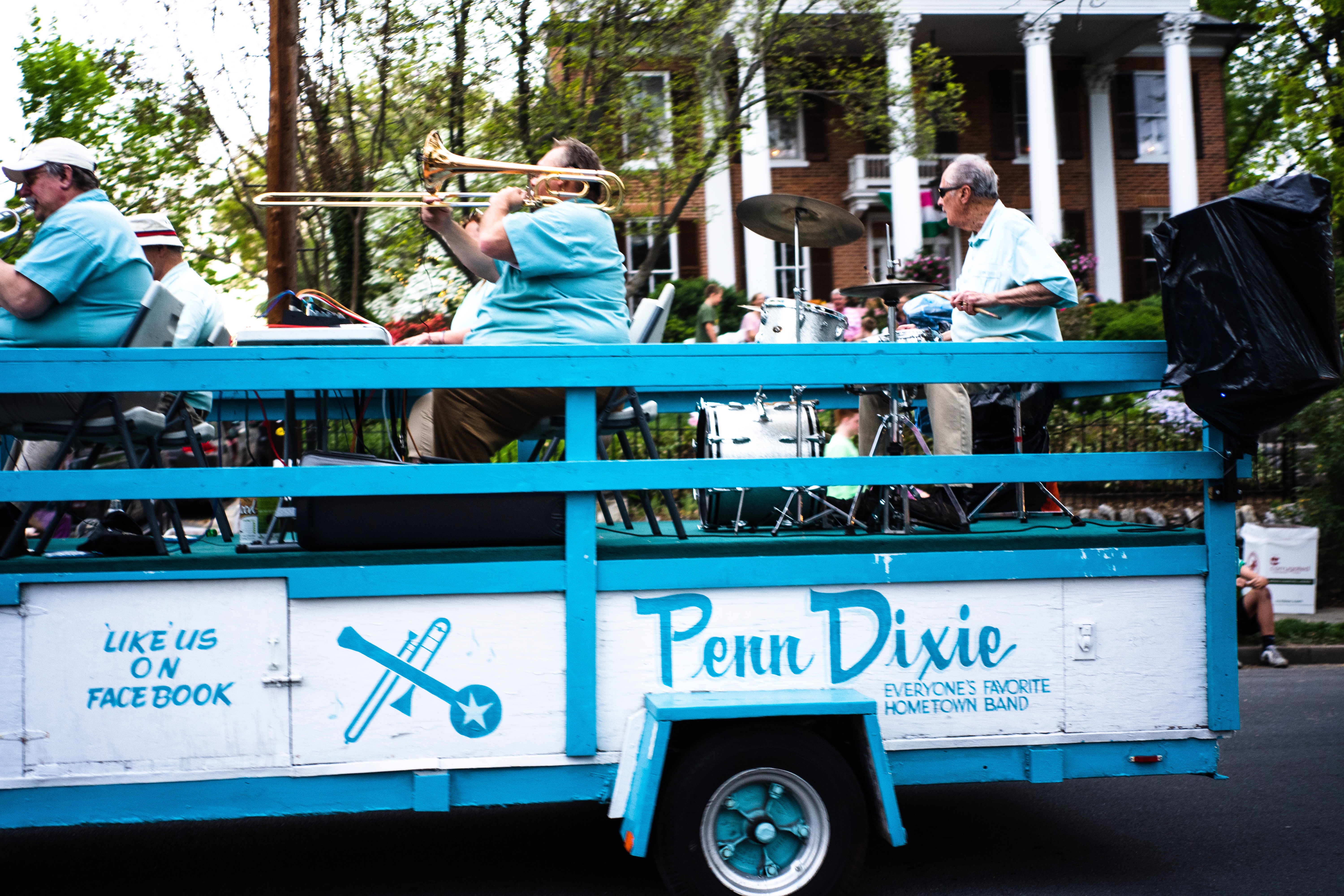 This vibrant photograph captures a lively scene of a hometown band performing on a decorated trailer during a parade. The musicians, clad in coordinating outfits, are immersed in their music, creating an atmosphere of celebration and nostalgia. With bright colors and soft natural lighting, the composition evokes a sense of community spirit and joy.