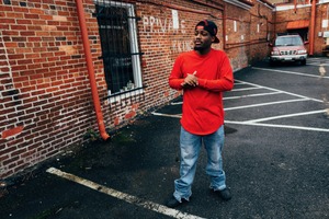 In a vibrant red long-sleeve shirt, the subject stands thoughtfully against a backdrop of textured brick and empty parking lines, conveying a sense of introspection amid the urban landscape. The moody lighting adds a gritty atmosphere, highlighting the contrast between his bold attire and the subdued environment. The composition draws the viewer's eye toward him, creating an intimate connection within the city's starkness.