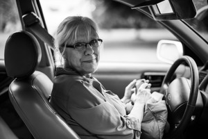 This black-and-white photograph captures an older woman sitting in the driver's seat of a car, her thoughtful expression radiating warmth and wisdom. The soft, diffused light highlights her features and creates a serene atmosphere, while the surrounding blur of greenery suggests a peaceful outdoor setting. The composition is intimate, drawing the viewer into this quiet moment of reflection and connection.