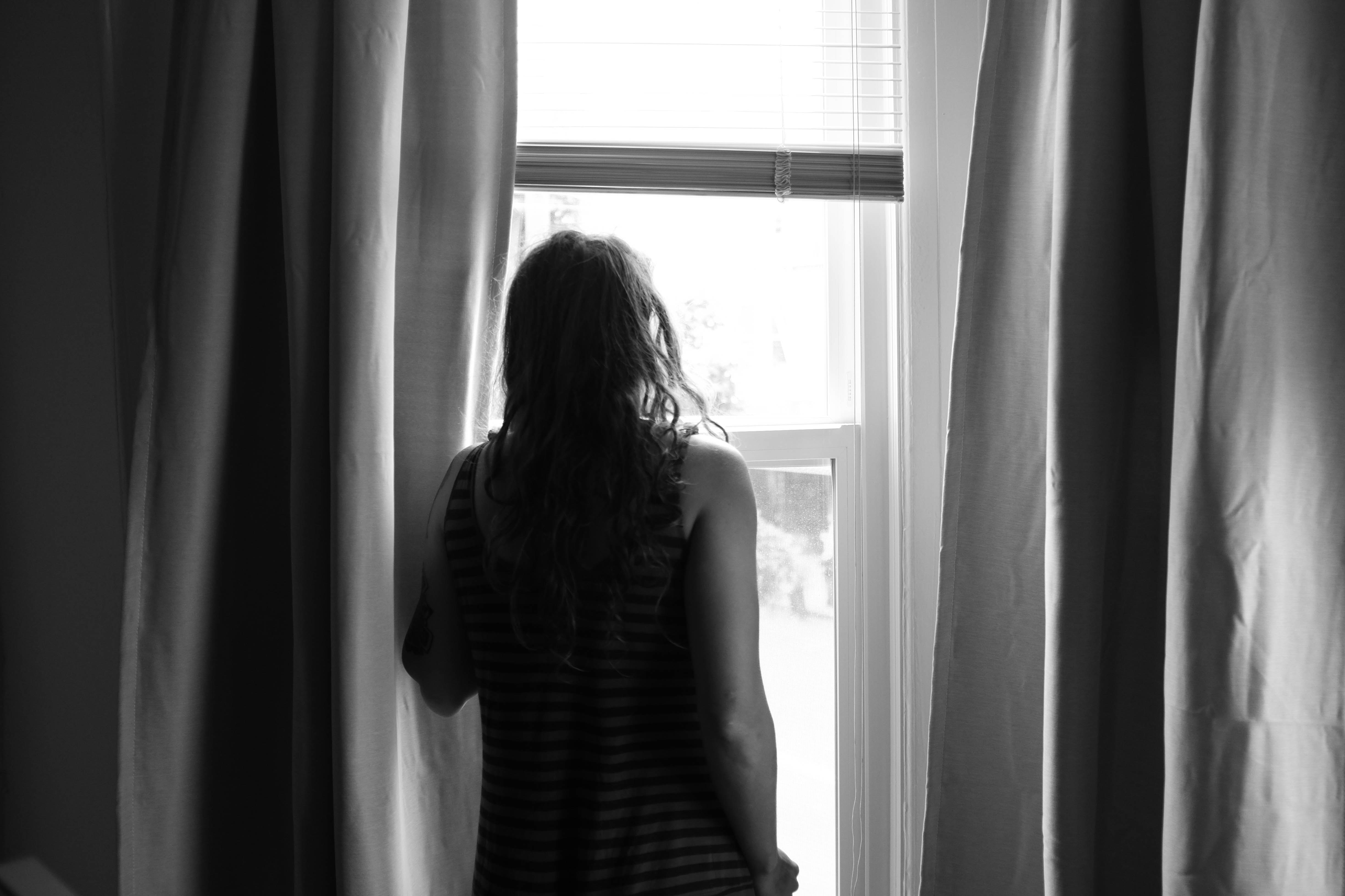 A silhouetted figure stands by a window, half-turned with a pensive posture. The soft, muted light filters through sheer curtains, casting gentle shadows that create a contemplative mood. The monochromatic tones enhance the sense of introspection, inviting the viewer to reflect on the subject's quiet moment of solitude.
