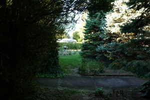 Framed by dense greenery, a tranquil pathway leads into a sunlit garden, inviting exploration. The soft lighting casts gentle shadows, enhancing the lush textures and hues of the foliage. A stone fountain peeks through the trees, suggesting an air of peaceful contemplation in this hidden oasis.