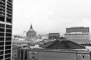 This black and white photograph captures a cityscape where historic and modern architecture coexist. The domed building stands as a central point of interest, shrouded in a veil of mist, while the surrounding structures hint at an urban jungle. The muted lighting adds a contemplative mood, inviting viewers to reflect on the contrasts of time and style.