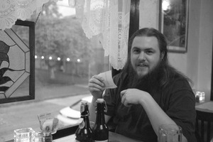 A solitary figure sits at a dimly lit table, framed by a delicate lace curtain and warm, ambient lighting. His expression conveys a relaxed confidence as he casually holds a receipt, surrounded by two dark glass bottles that hint at a cozy gathering. The black-and-white composition emphasizes a reflective mood, inviting viewers to ponder the simple yet intimate nature of the scene.