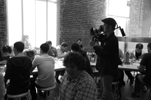In a spacious, softly lit room, a group of individuals is engrossed in discussion and activity around a long table, focusing on their tasks. The subtle interplay of light filtering through large windows casts a gentle glow, creating a contemplative and collaborative mood. A lone filmmaker stands apart, capturing the vibrant energy of the moment, hinting at the intersection of creativity and documentation.