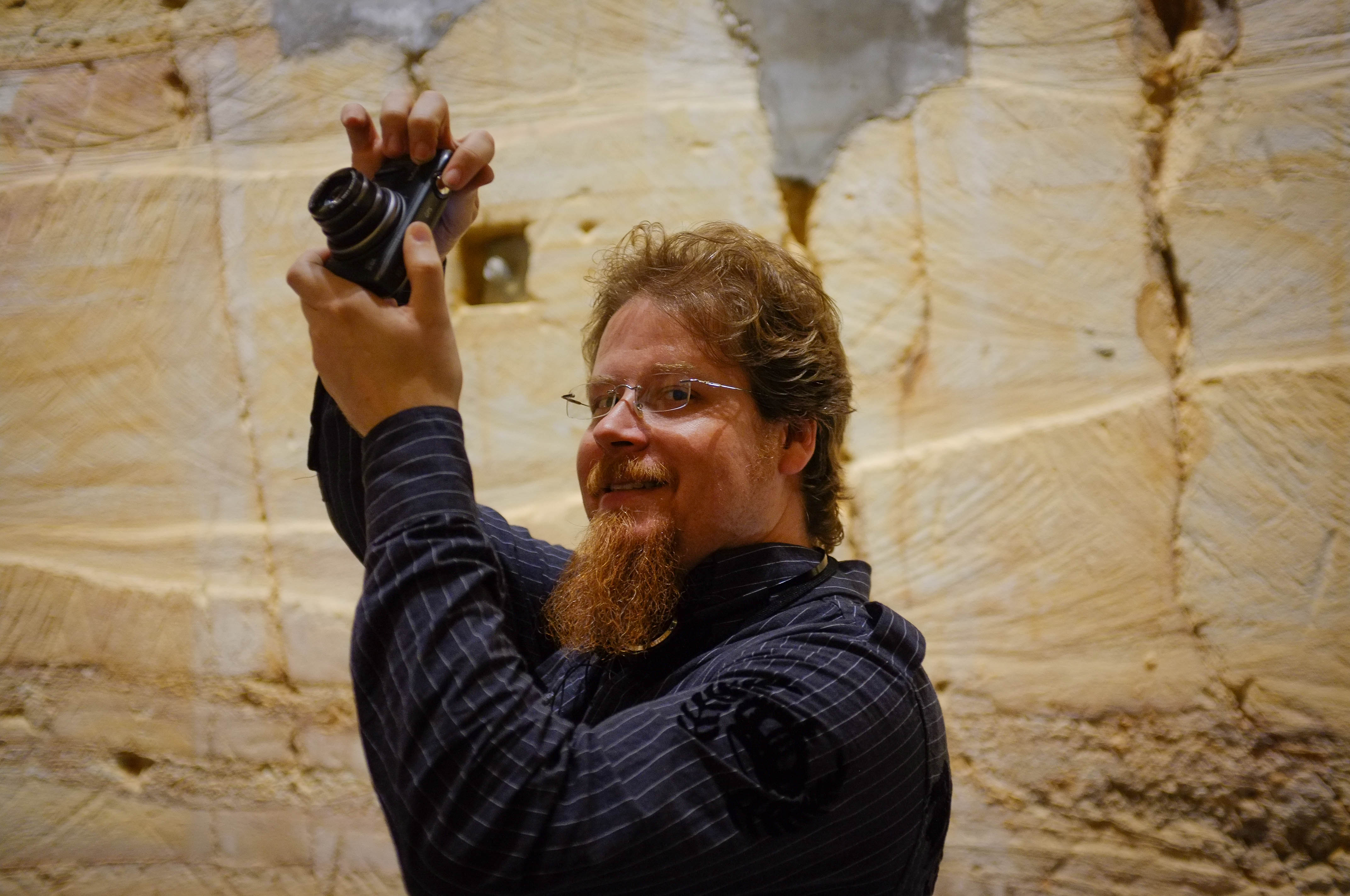 In this intimate moment, a man with a joyful expression holds a camera, ready to capture a memory. The warm, soft lighting highlights his features against a textured backdrop of raw stone, creating a sense of wonder. His enthusiasm is palpable, conveying a blend of passion and curiosity in this artistic setting.