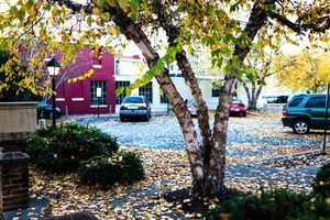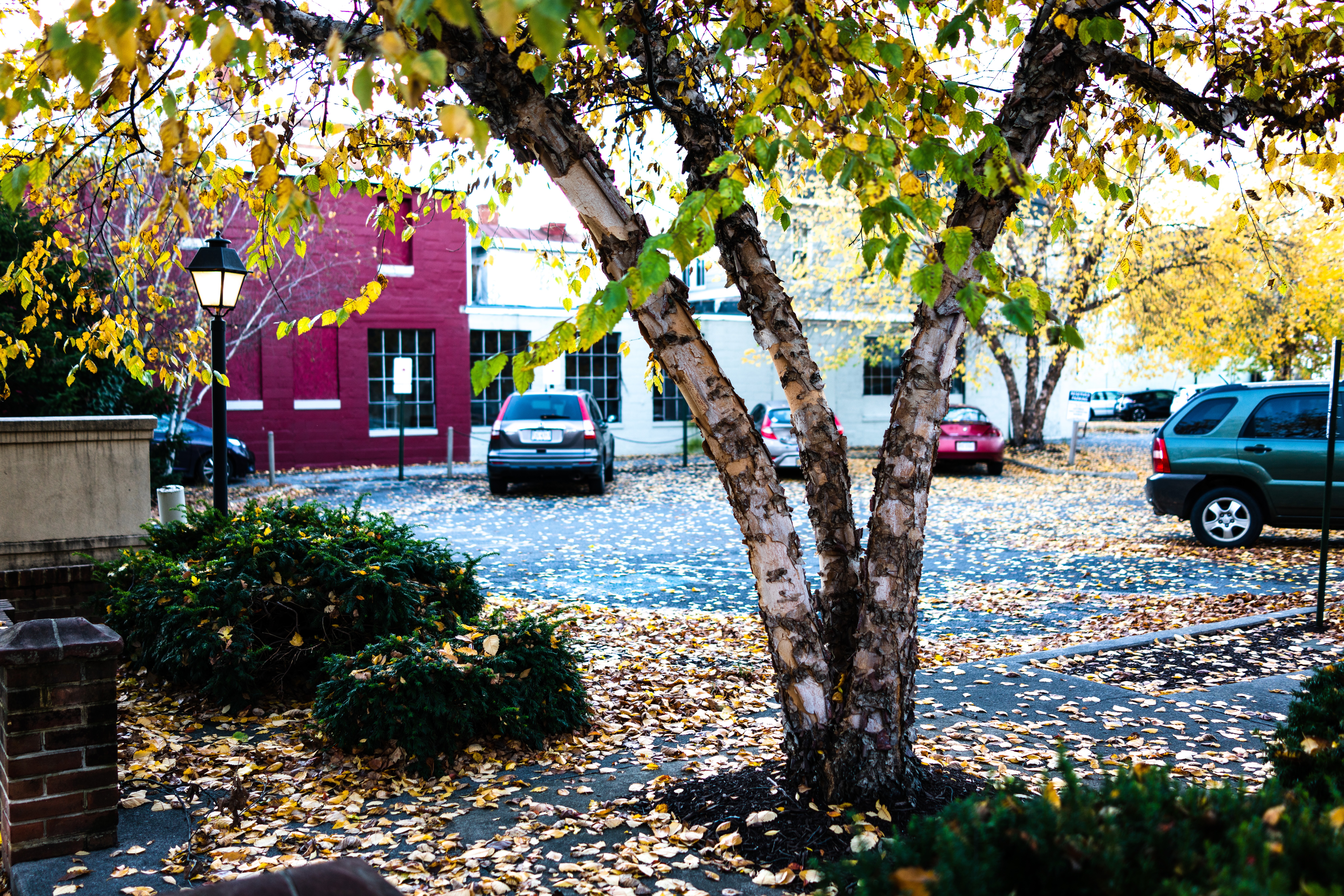 A striking scene captures the essence of autumn, featuring a birch tree shedding its vibrant yellow leaves onto a carpet of fallen foliage. The composition is framed by leafy branches and a backdrop of red and neutral buildings, creating a cozy sense of depth. Soft, natural lighting enhances the tranquil atmosphere, inviting the viewer to pause and reflect amidst the seasonal change.