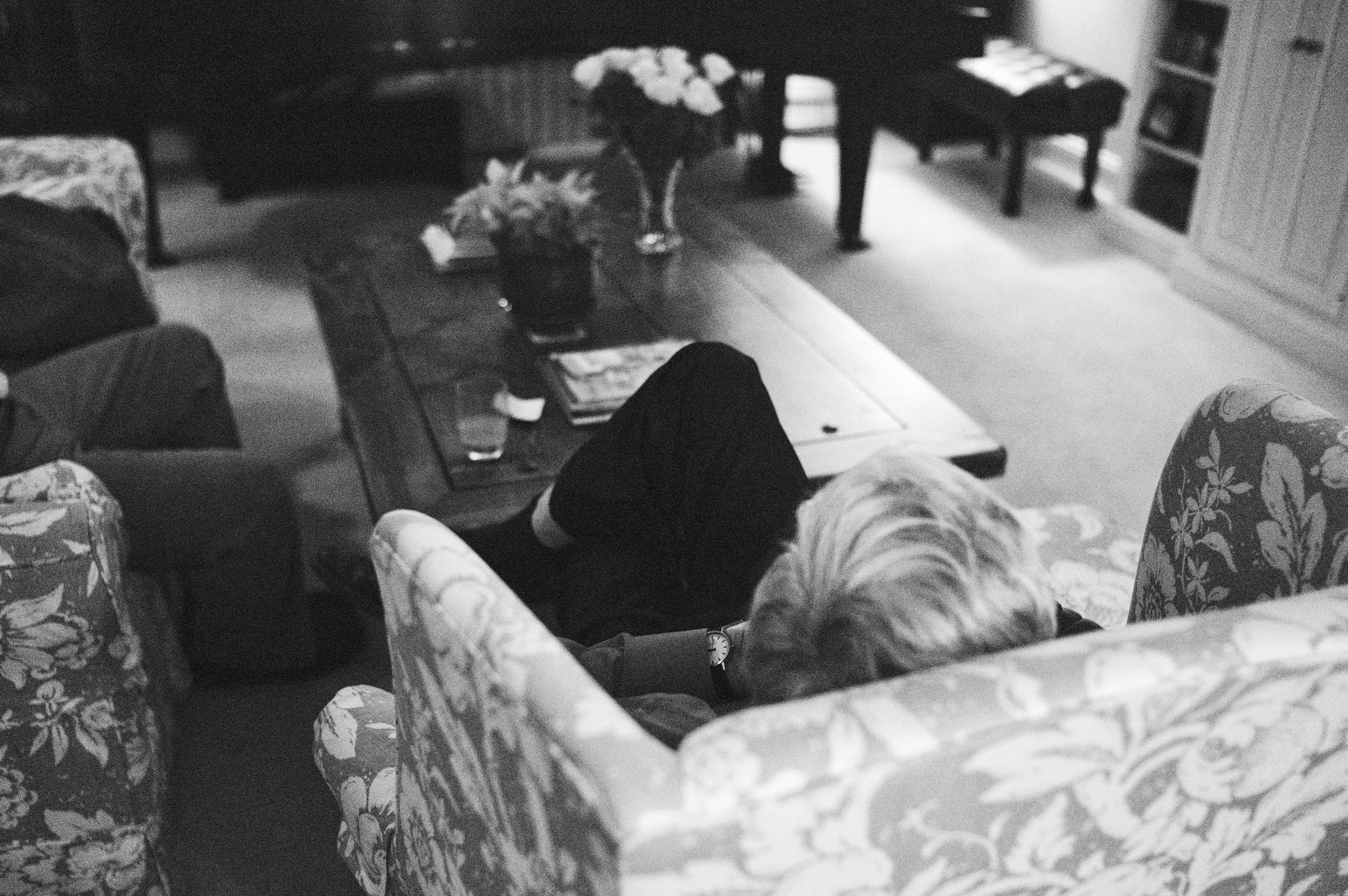 The photograph captures a cozy, intimate living room scene, focusing on the tranquil repose of a person nestled within a floral-patterned armchair. Soft lighting creates a warm ambiance, while the monochromatic palette enhances the sense of nostalgia. The composition invites viewers into a moment of quiet reflection, contrasting the lively patterns of the furniture with the serene stillness of the subject.