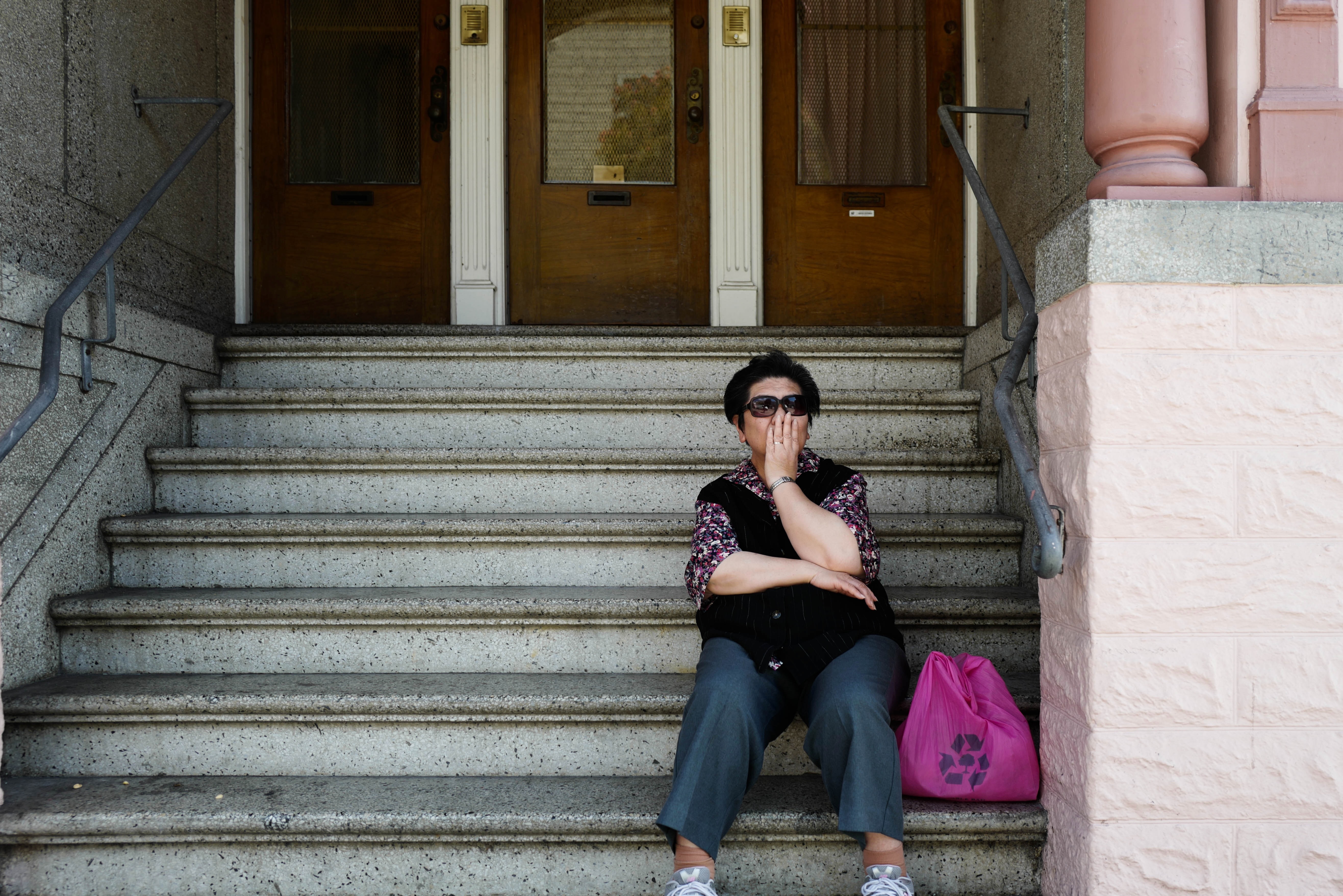 A woman sits thoughtfully on the steps of a building, partially shaded from the sunlight. Her pose, with one hand on her face and sunglasses perched atop her head, conveys a moment of quiet reflection or contemplation. The warm tones of the stone steps and contrasting colors of her attire and bag create a relaxed yet introspective mood in the composition.