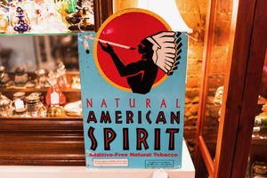 The photograph showcases a vintage sign for Natural American Spirit, featuring a stylized silhouette of a Native American figure playing a flute against a vibrant round backdrop. The background is filled with various collectibles, creating a nostalgic and eclectic atmosphere, while warm lighting enhances the rich colors of the sign, evoking a sense of history and character.