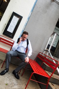 A man in a button-up shirt sits on a bright red bench, intently engaged in a phone call. The contrasting colors and casual urban setting evoke a sense of modern life’s hustle, while the man's focused expression suggests a moment of serious thought amidst the bustling surroundings. Soft natural light illuminates the scene, highlighting the man's attire and the vibrant bench against the muted background.