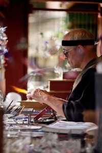 In this intimate scene, a skilled artisan delicately shapes molten glass with intense focus. The warm glow of the flame contrasts with the soft natural light filtering through, creating a serene yet vibrant atmosphere. The composition draws attention to both the intricate tools and the masterful handwork, embodying the artistry and patience involved in glassblowing.