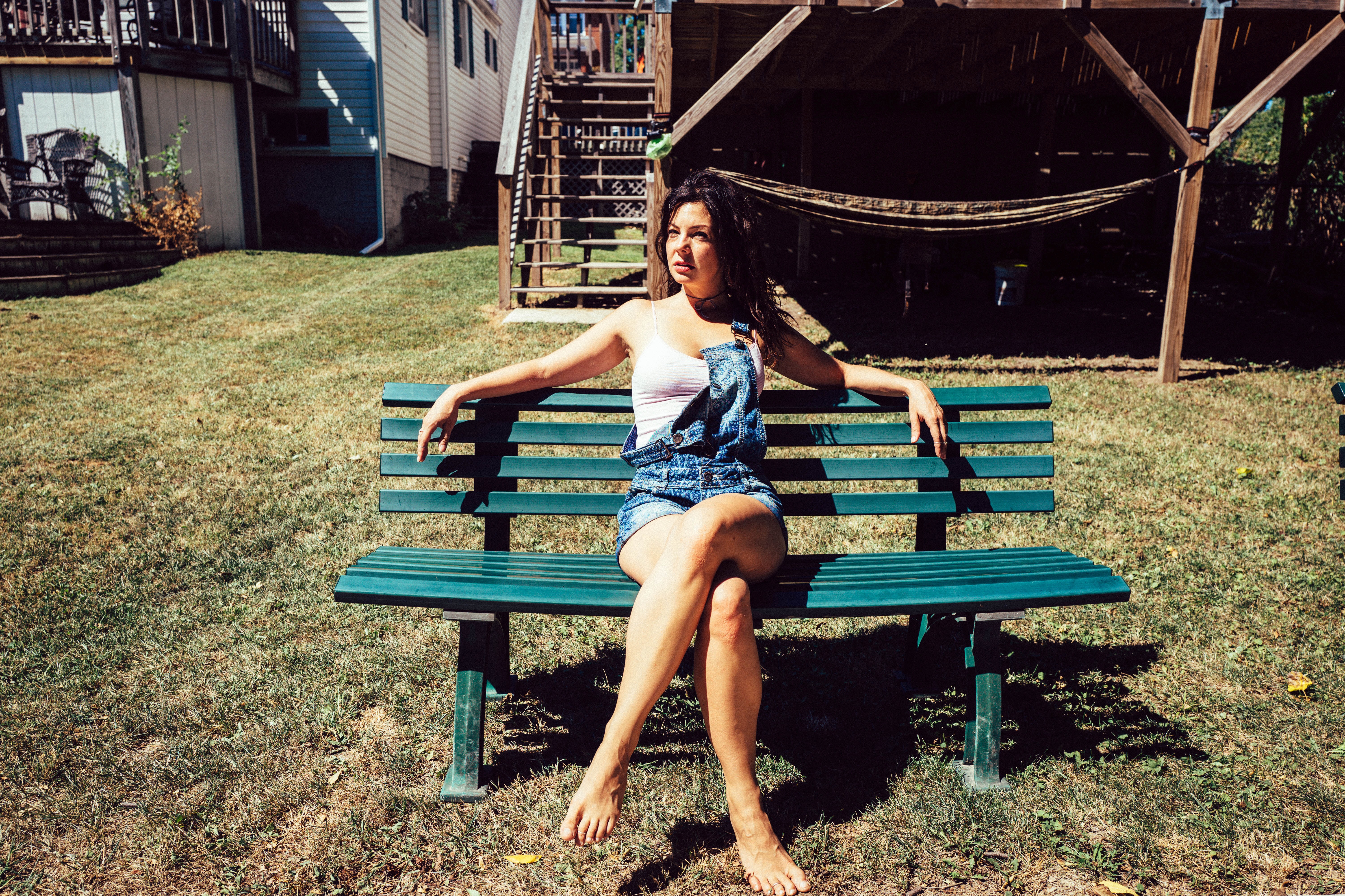A young woman sits confidently on a vibrant green bench, exuding a relaxed summer vibe. The sunlight casts a warm glow, highlighting her casual outfit and the natural surroundings, while the composition draws attention to her poised demeanor against a backdrop of home and leisure.
