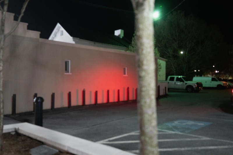 In this nighttime scene, a muted palette of dark tones is contrasted by a striking red glow emanating from a wall, creating an atmosphere of mystery and intrigue. The composition is framed by a tree on the left, which softens the harshness of the industrial setting, while distant lights hint at life beyond the immediate foreground. The interplay of shadows and artificial light engages the viewer, evoking a sense of curiosity about the hidden narratives of the night.