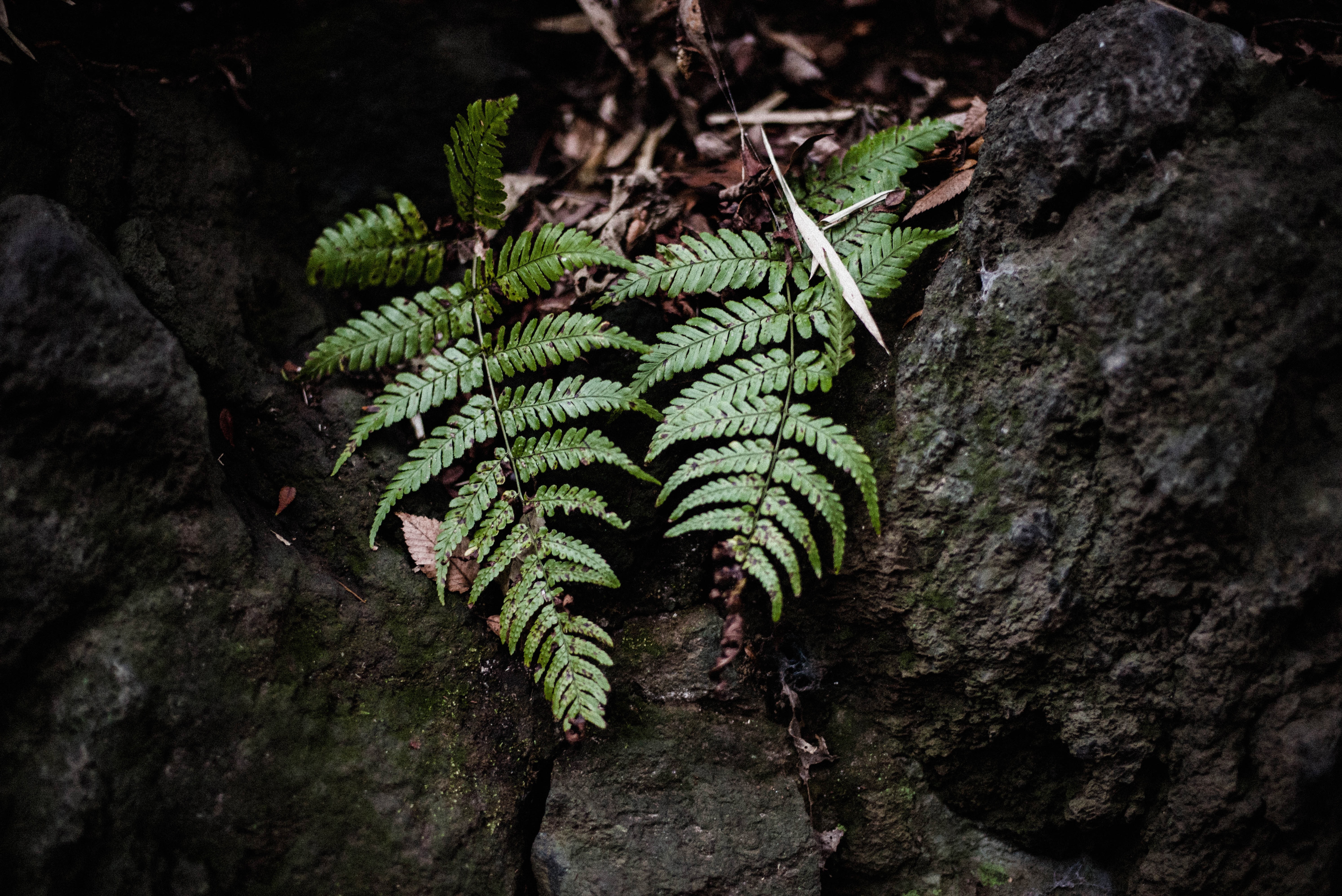 Nestled between rugged stones, a pair of vivid green ferns flourish with quiet determination. The shadowy, muted lighting creates a sense of intimacy, highlighting the delicate textures of the leaves against the rough backdrop. This image evokes a tranquil, yet resilient mood, celebrating nature's ability to thrive in unexpected places.