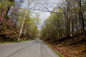 The photograph captures a serene, winding road flanked by lush green trees, hinting at early spring. With soft, diffused light filtering through the branches, the atmosphere is tranquil yet vibrant, inviting viewers to explore the path ahead. Delicate pops of purple from budding flowers add a subtle charm to the natural setting, enhancing the overall sense of renewal.