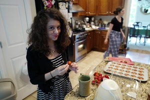 In a cozy kitchen filled with warm wood tones, a young woman playfully holds a strawberry, her smile radiating joy and mischief. The bright natural light flooding through the window enhances the inviting atmosphere, while the blurred figure of another person nearby adds a sense of dynamic activity to the scene. The composition captures a moment of shared creativity and warmth, celebrating the simple pleasures of cooking and connection.