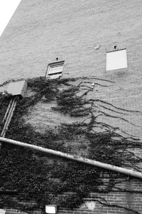 This photograph captures a weathered brick wall partially engulfed by creeping ivy, showcasing nature's persistence against man-made structures. The stark contrast of black and white emphasizes the texture of both the bricks and the foliage, giving it a melancholic yet serene mood. The composition draws the eye upward, highlighting the interplay between architecture and organic life, while soft light creates gentle shadows that add depth to the scene.