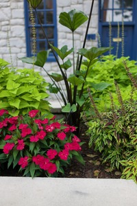 This photograph captures a lush garden scene, alive with vibrant red flowers contrasting against a backdrop of rich green foliage. The soft lighting enhances the colors, creating a serene and inviting atmosphere that draws the viewer in. The composition, centered around the flowers, showcases the intricate layers of botanical life while subtly hinting at the charming blue doors in the background.