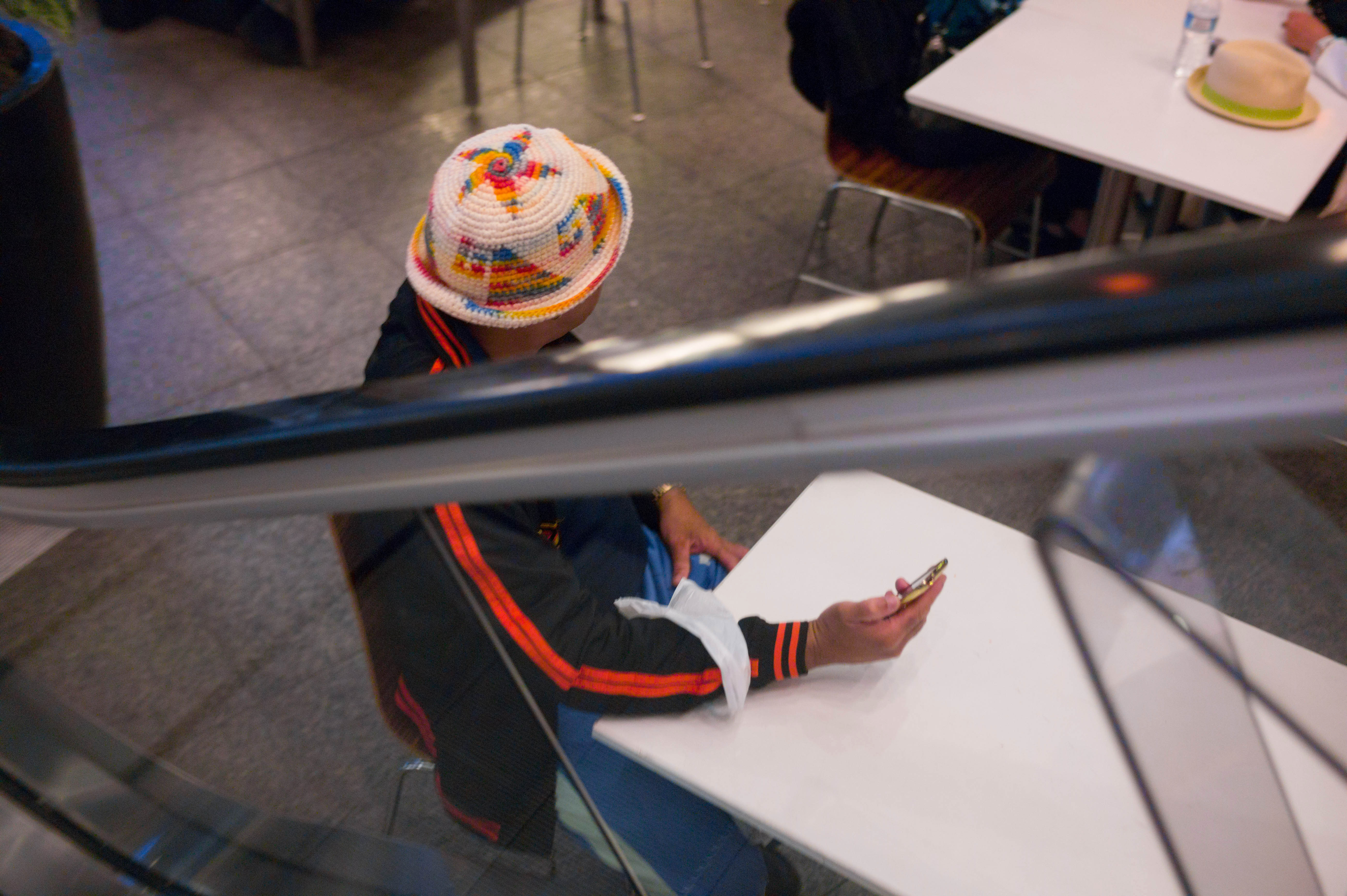 The photograph captures a solitary figure seated at a table, absorbed in their smartphone. Wearing a vibrant, patterned hat, their relaxed demeanor contrasts with the bustling atmosphere around them. Soft, diffuse lighting creates an intimate mood, highlighting the subject's isolation amidst the urban environment.