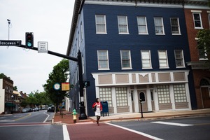 A woman in a vibrant red jacket strolls across a city intersection, juxtaposed against the cool tones of a blue building. The scene is captured in soft, diffused light, creating a calm yet urban ambiance. The composition is balanced with the pedestrian sign and street furniture drawing the eye, emphasizing the rhythm of city life.