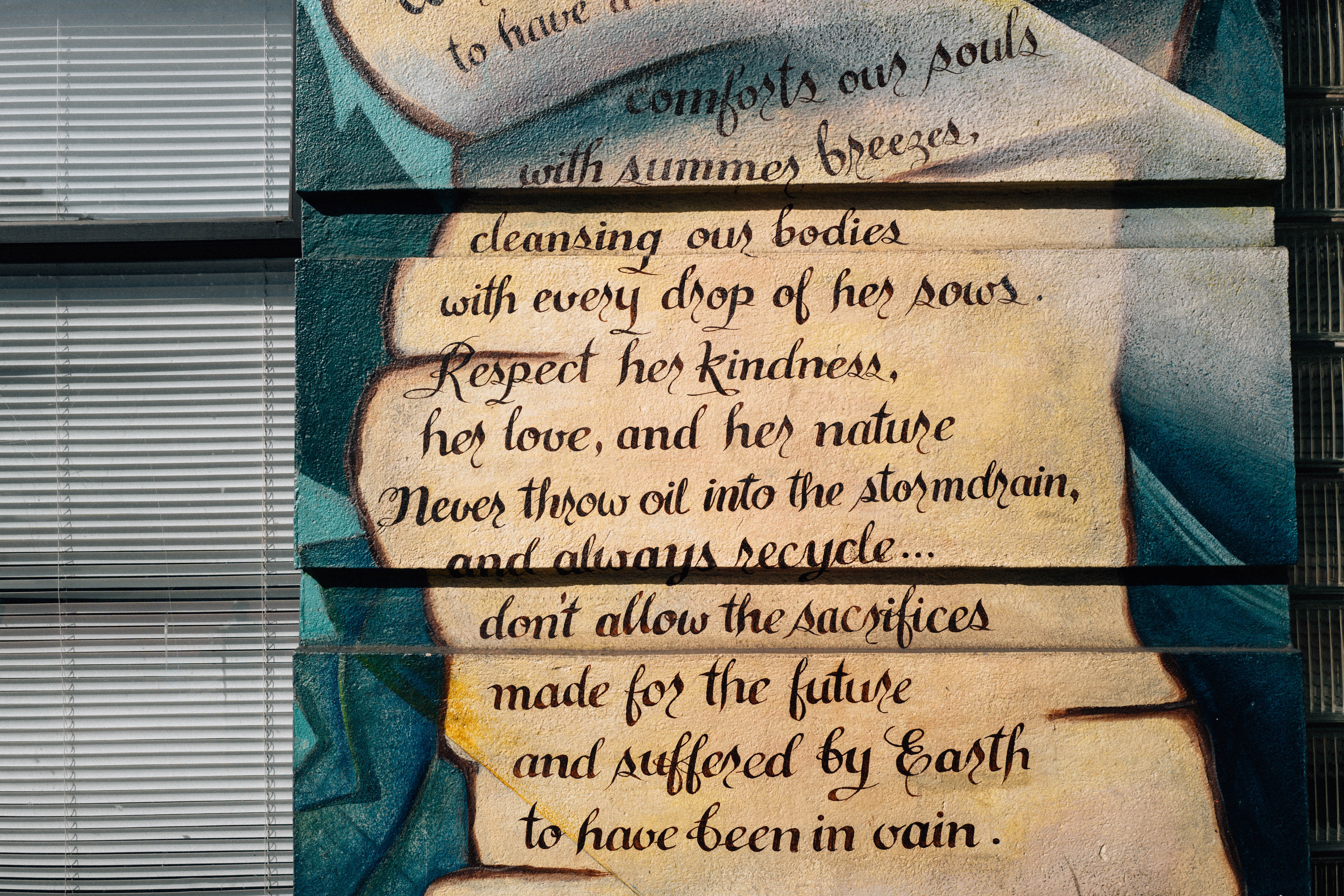 This photograph captures a vibrant mural featuring poetic text that emphasizes the importance of respecting nature. The warm, natural lighting adds a serene quality, effectively highlighting the mural's intricate calligraphy and evocative color palette. The composition, focusing on the text, invites reflection on environmental stewardship and the future of our planet.