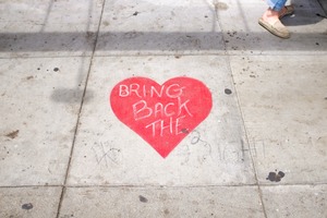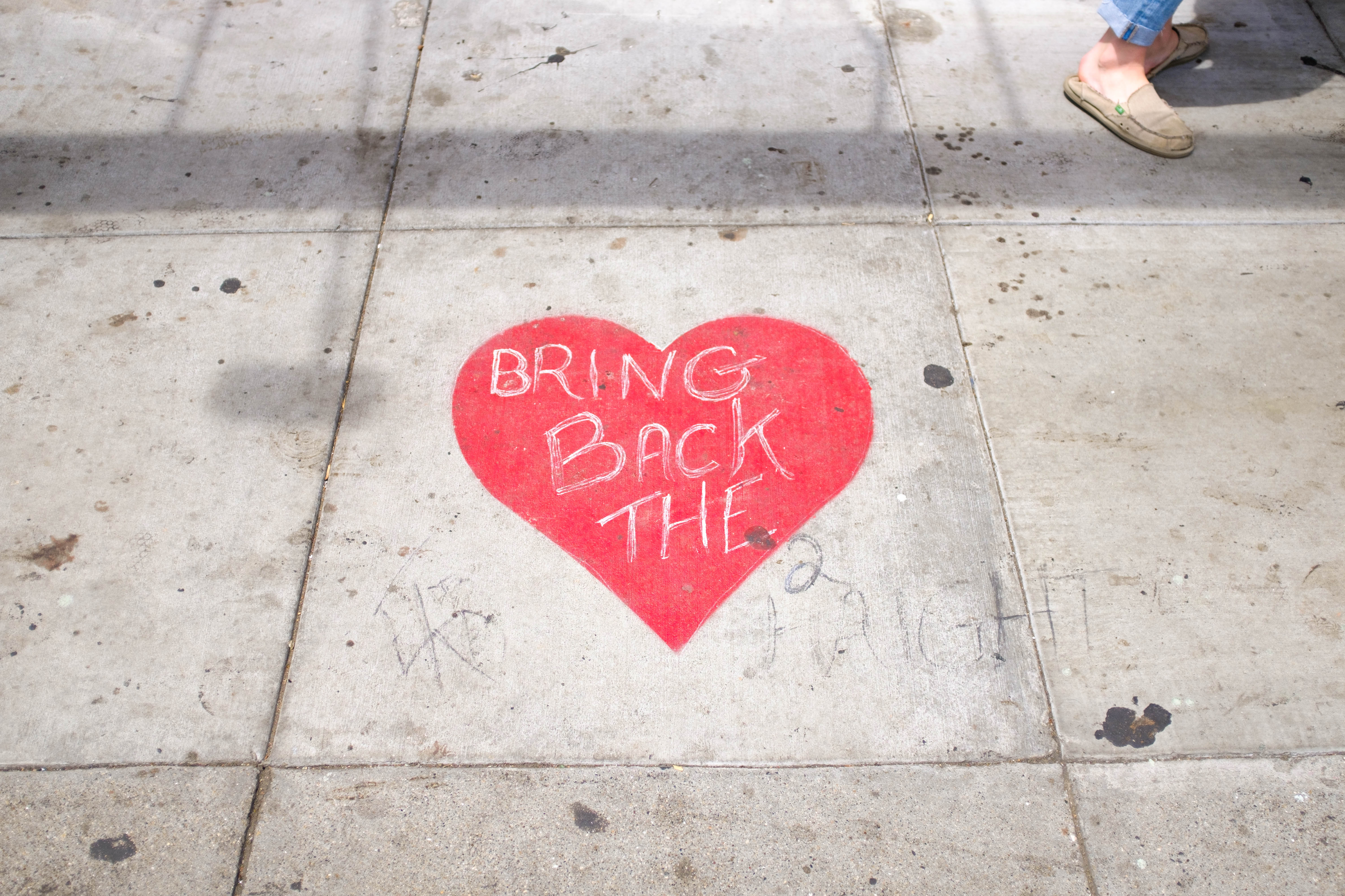 A bright red heart painted on a gray sidewalk boldly states, "BRING BACK THE" in white lettering, evoking a sense of yearning. The surrounding worn pavement adds a touch of urban authenticity, while the sunlight creates gentle shadows, lending warmth to the scene. A passerby’s foot partially enters the frame, emphasizing the everyday context of this compelling message.