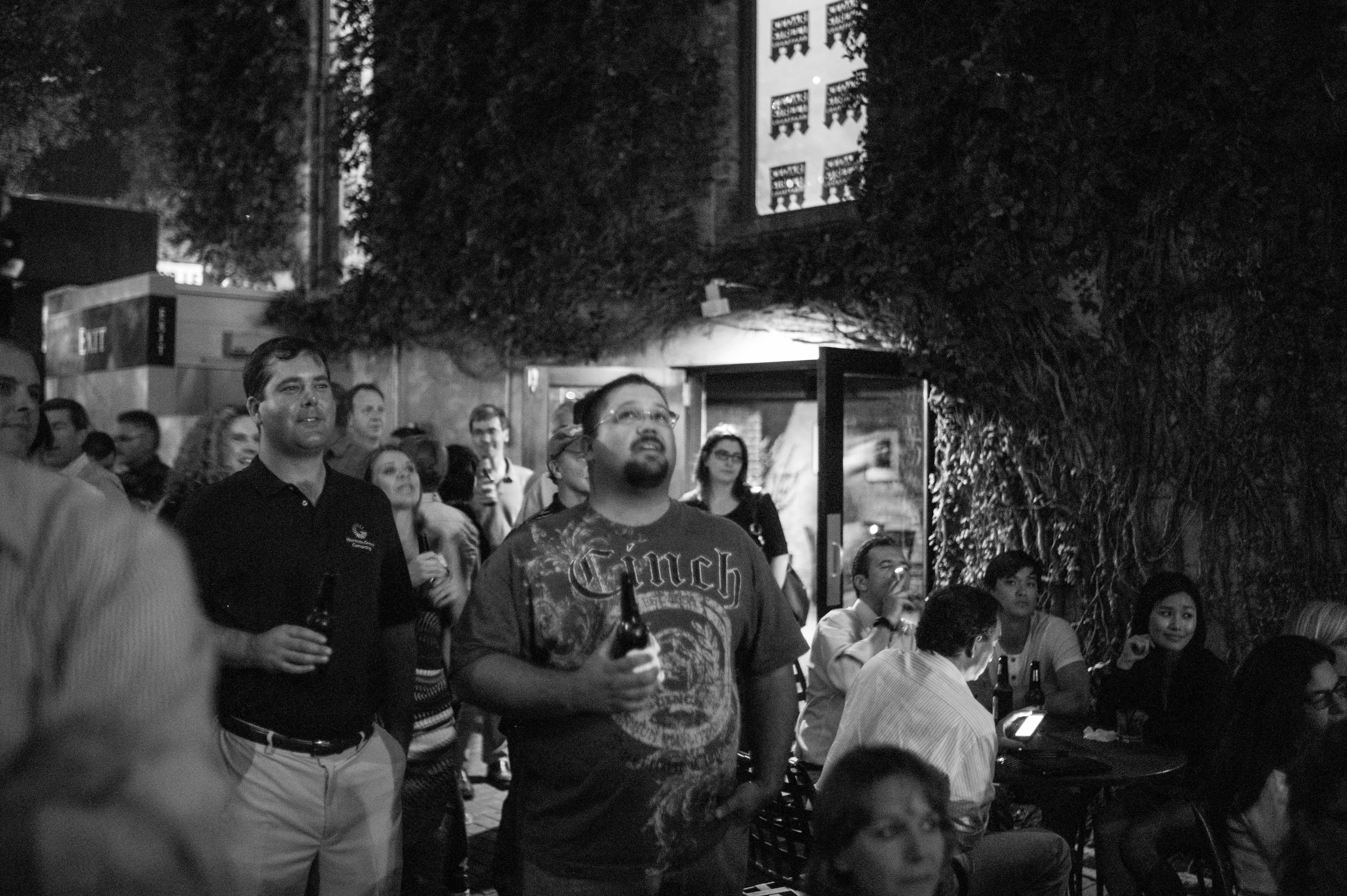 A lively crowd gathers under a soft, ambient glow, captured in striking black and white. The expressions of curiosity and engagement reflect the shared excitement of the moment, while the rich textures of the surrounding foliage add depth to the scene. The mix of light and shadow creates a dynamic atmosphere, enhancing the intimate, communal vibe of the gathering.