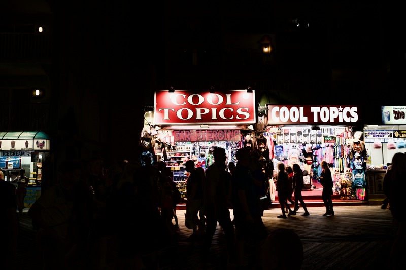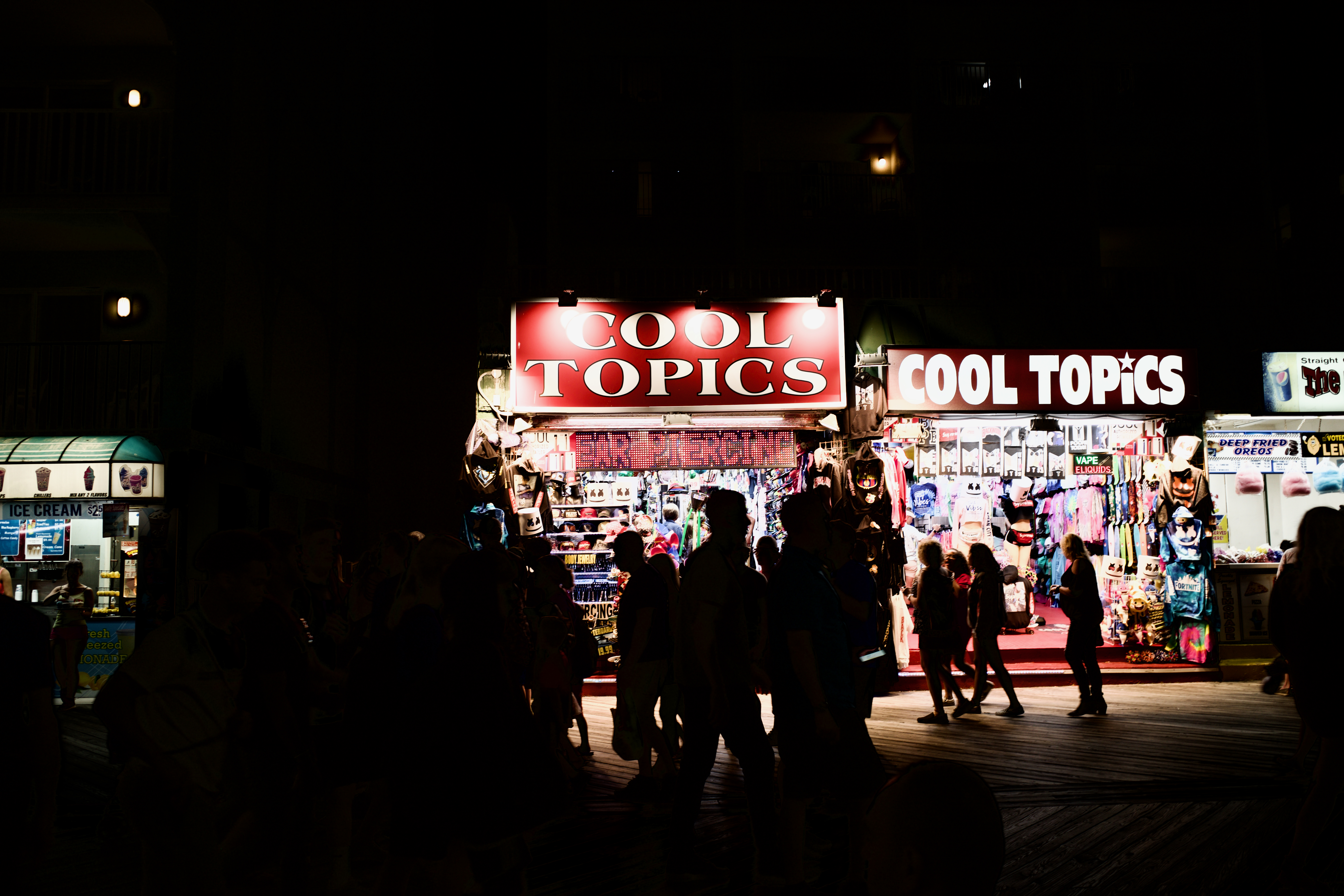 The photograph captures a bustling night scene at a lively shop named 'Cool Topics.' Bright neon lights illuminate the colorful merchandise, while shadows of people create a dynamic contrast against the illuminated storefront, evoking a sense of excitement and adventure in the night atmosphere.