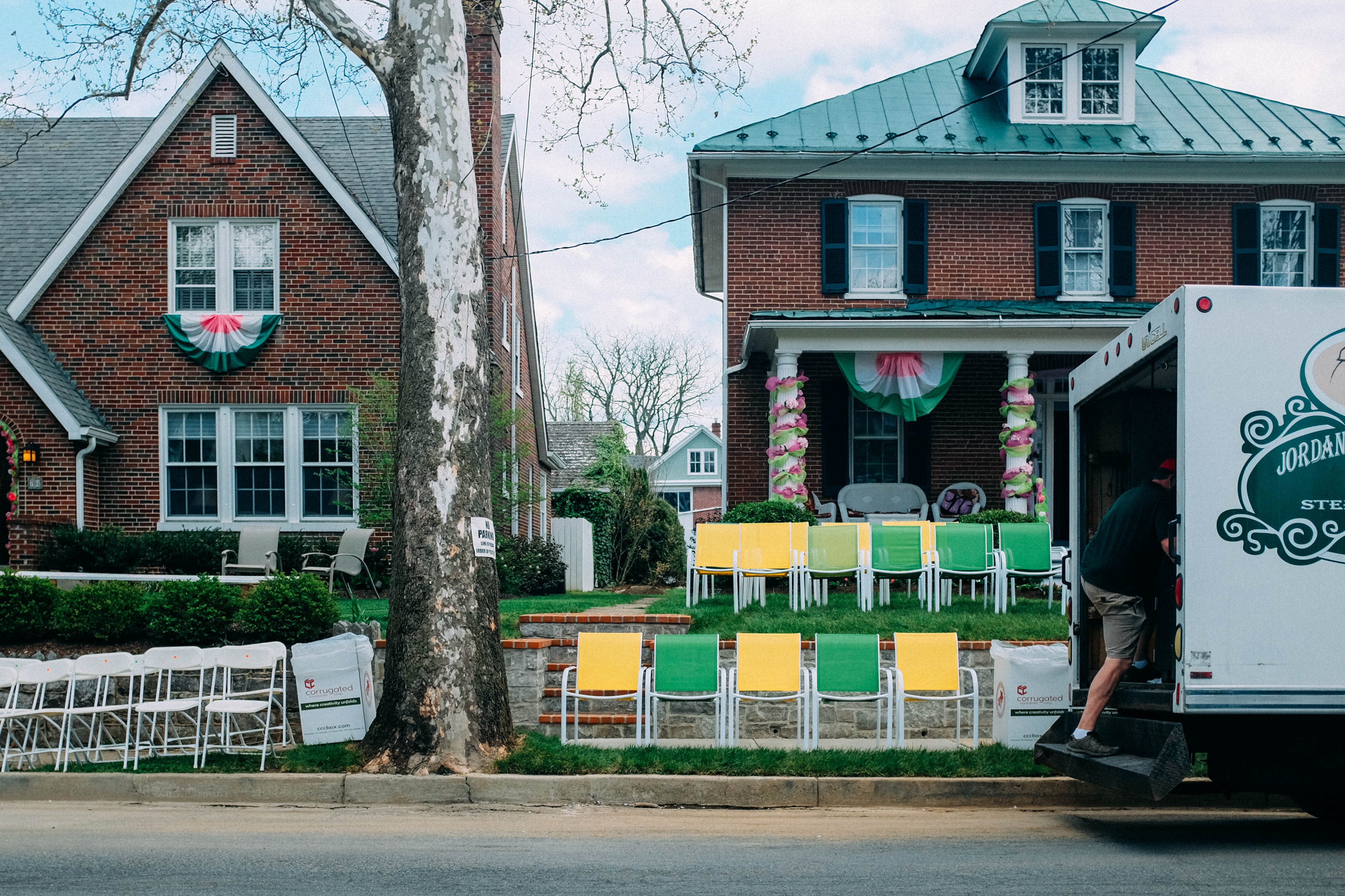 The photograph captures two charming brick houses adorned with festive decorations, hinting at a gathering or celebration. Brightly colored chairs line a lush yard, creating a vibrant, inviting atmosphere under soft, diffused daylight. A delivery person, busy with preparations, adds a sense of anticipation and liveliness to the scene.