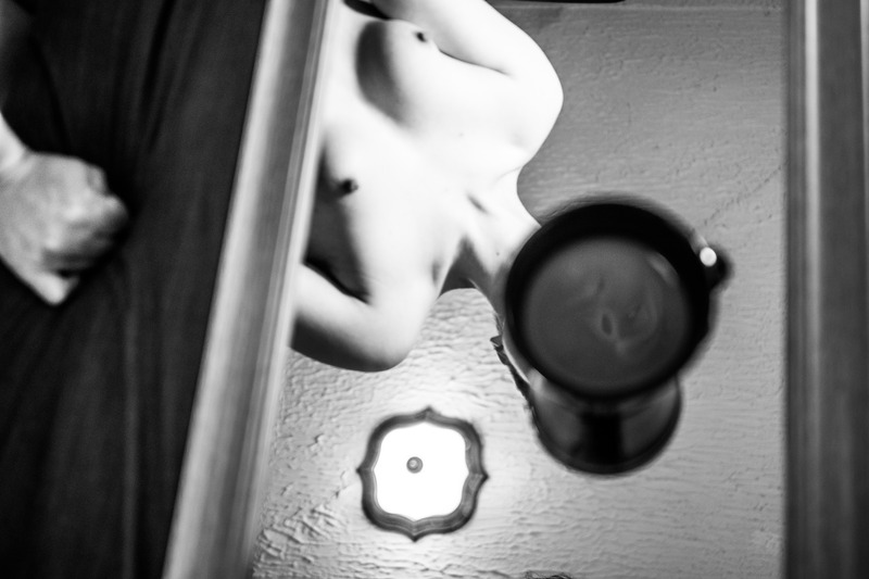 In this striking black-and-white photograph, the subject is captured from an unusual overhead perspective, revealing a sense of intimacy and introspection. The soft lighting enhances the delicate curves of the figure, while the reflections in the surrounding surfaces create a dreamlike quality. The composition is both intimate and contemplative, inviting viewers to ponder the relationship between perception and reality.