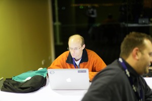 In a softly lit environment, a man engrossed in his laptop captures a moment of concentration and solitude. His vibrant orange sweater contrasts with the muted background, accentuating his focus amidst the dimly lit space. Shadows and blurred figures around him hint at the bustling energy of the surroundings, creating a mood of introspective productivity.