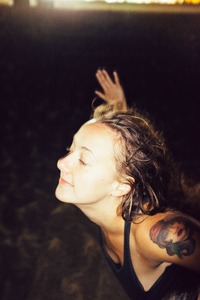 The photograph captures a woman in a moment of bliss, her head tilted back and eyes closed, exuding a sense of freedom and serenity. The soft illumination creates a gentle contrast, highlighting her features and flowing hair against a dark, dusky background. The visible tattoo adds a personal touch, enhancing the intimate and relaxed mood of the scene.