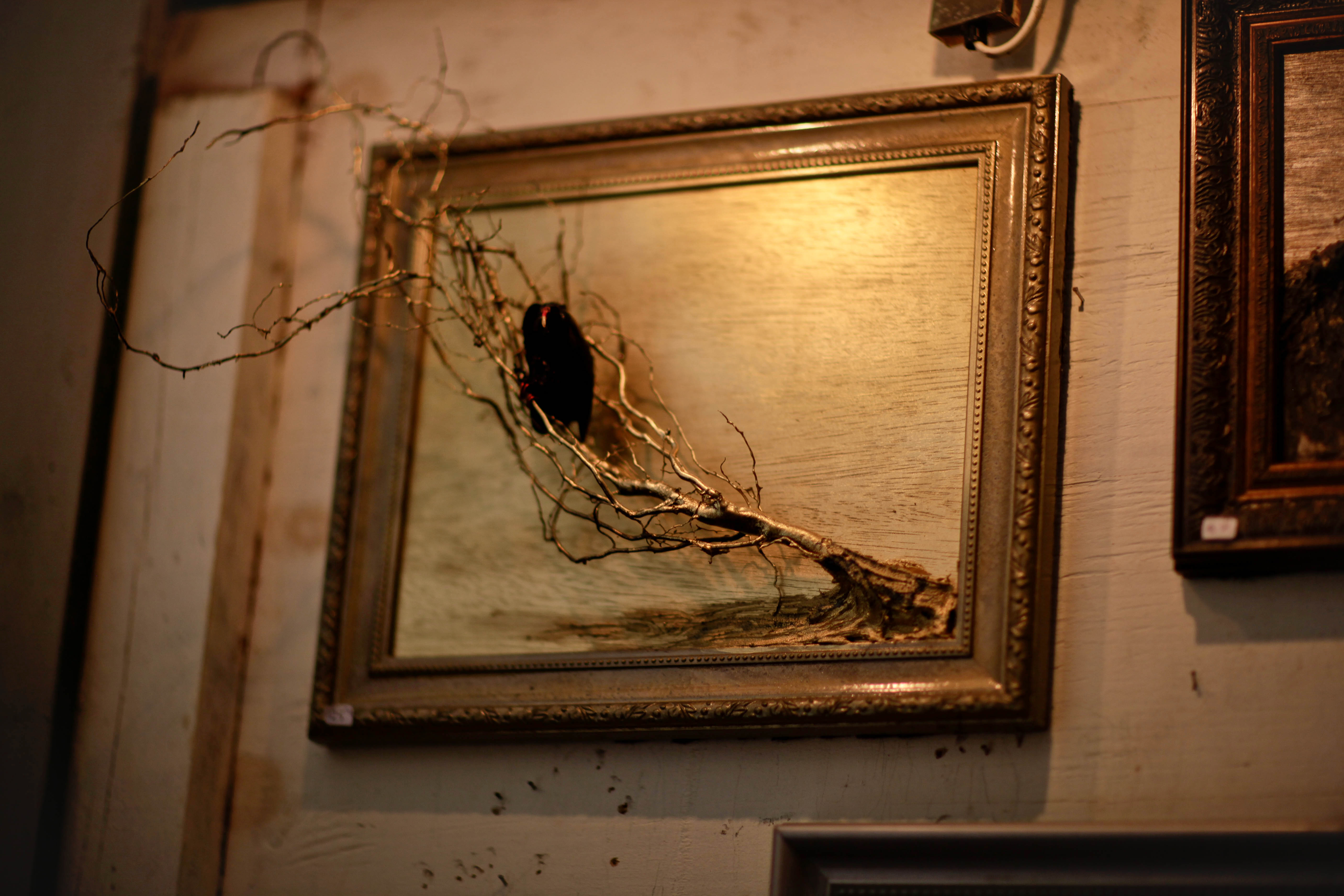 The photograph captures an artwork framed in an ornate gold frame, featuring a delicate branch with a dark, glossy shape, possibly a bird. Soft, warm lighting enhances the textured surface of the painting, creating a serene yet slightly eerie atmosphere. The composition draws the viewer's eye to the interplay between nature and art, inviting contemplation.
