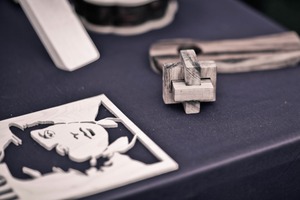 This photograph captures a collection of intricately designed wooden objects resting on a dark surface, evoking a sense of craftsmanship and creativity. The balanced composition features a stylized portrait carved into wood alongside a wooden puzzle, softened by gentle, diffused lighting that enhances the warmth of the materials. The overall mood is tranquil and reflective, inviting viewers to appreciate the artistry and detail in each piece.