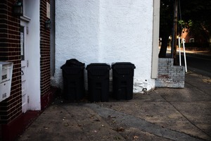 In this stark urban scene, three black trash bins stand conspicuously against a white wall, creating a striking contrast that draws the viewer's eye. The muted lighting casts soft shadows, enhancing the feeling of isolation, while the nearby architectural elements and fallen leaves suggest a narrative of everyday life and neglect. This composition encapsulates a moment of quiet reflection amidst the bustle of the city.