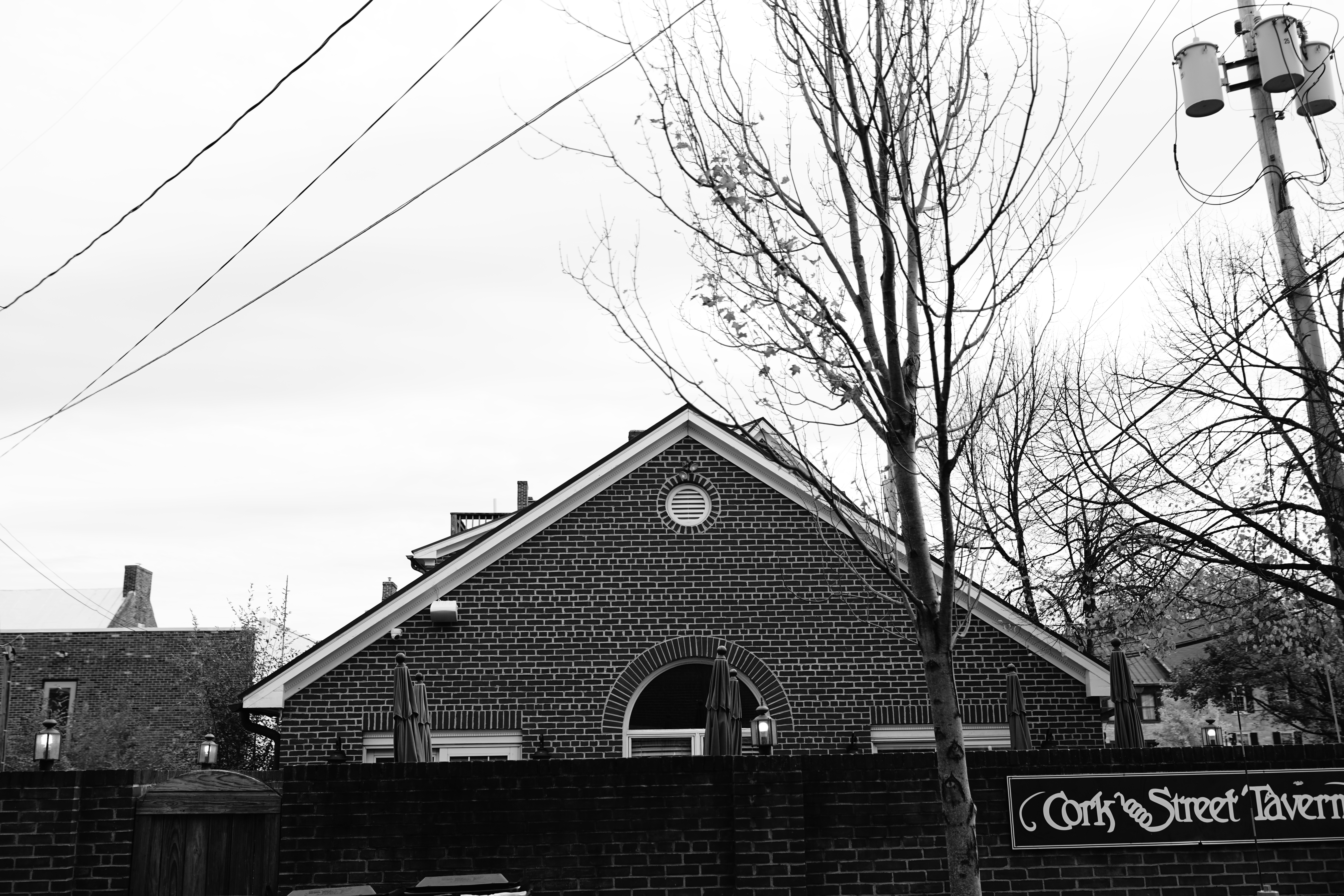 The photograph captures the back of a charming brick tavern, enveloped in a somber yet nostalgic atmosphere accentuated by black and white tones. Sparse branches reach skyward against a softly overcast sky, while electrical lines add a subtle urban touch to the subdued scene. The composition invites contemplation, suggesting a moment of pause in the lively bustle of city life.