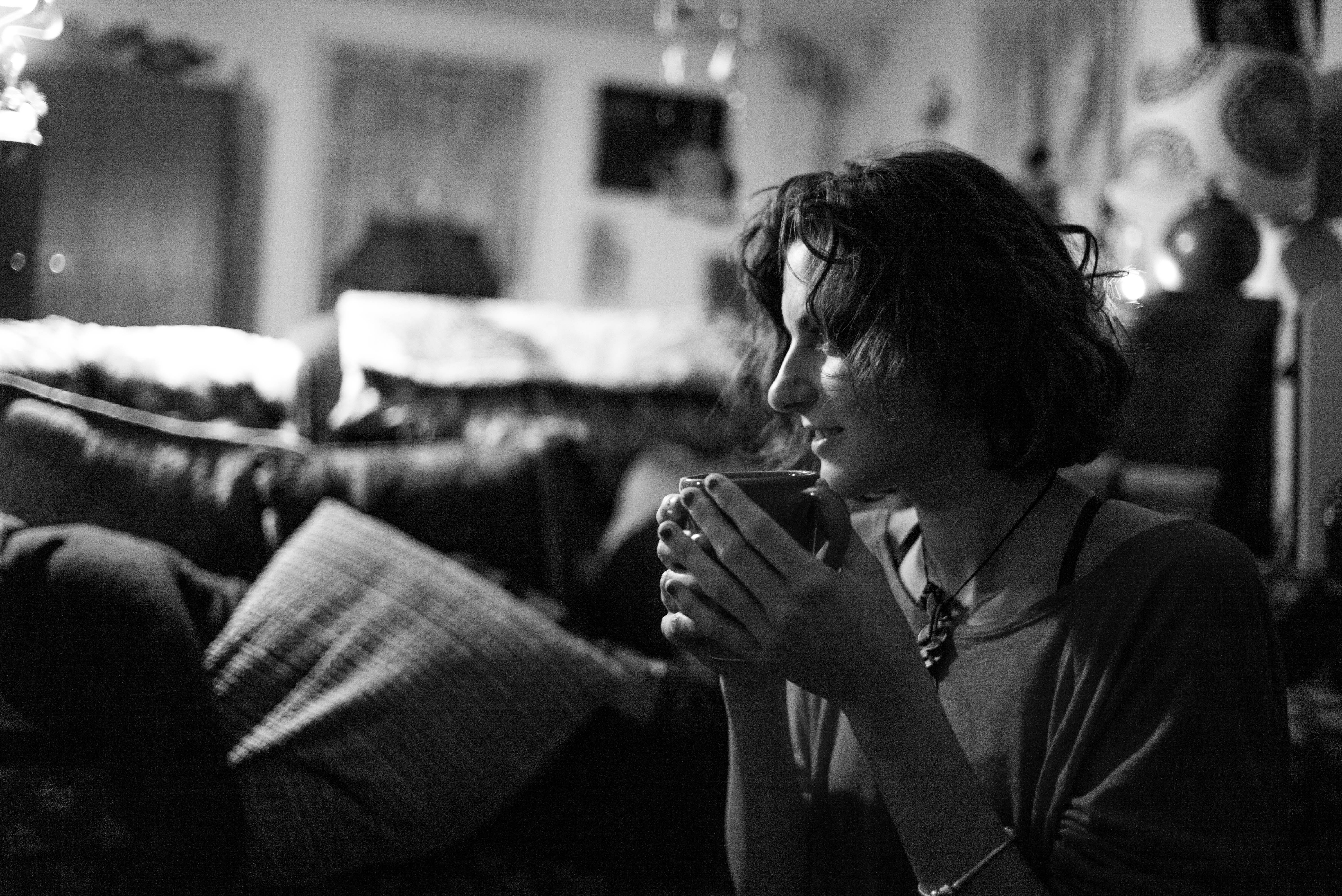 In this intimate black-and-white photograph, a woman cradles a cup close to her face, her expression serene and contemplative. The soft lighting casts gentle shadows, enhancing the cozy atmosphere of the surrounding cluttered space, dotted with textures and patterns. The composition draws the viewer's gaze towards her thoughtful demeanor, evoking a sense of warmth and stillness amidst the subdued chaos of home life.