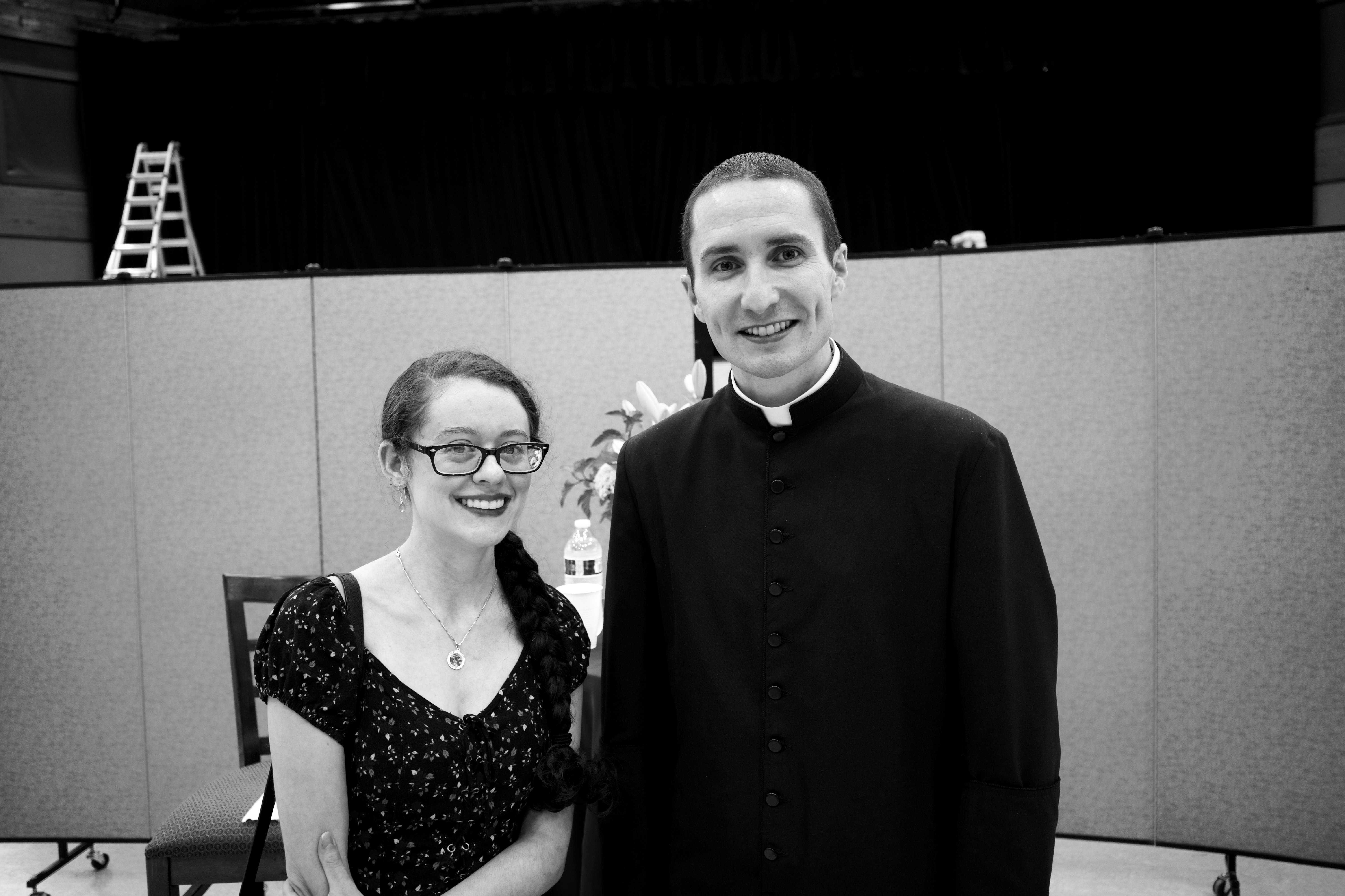 In this black and white photograph, a woman and a man in clergy attire pose together, radiating warmth and camaraderie. The simple background and soft lighting create an intimate atmosphere, highlighting their joyful expressions and the sense of a special occasion. The contrast between their outfits—a casually elegant dress and a formal clerical garment—adds an intriguing dynamic to the composition.