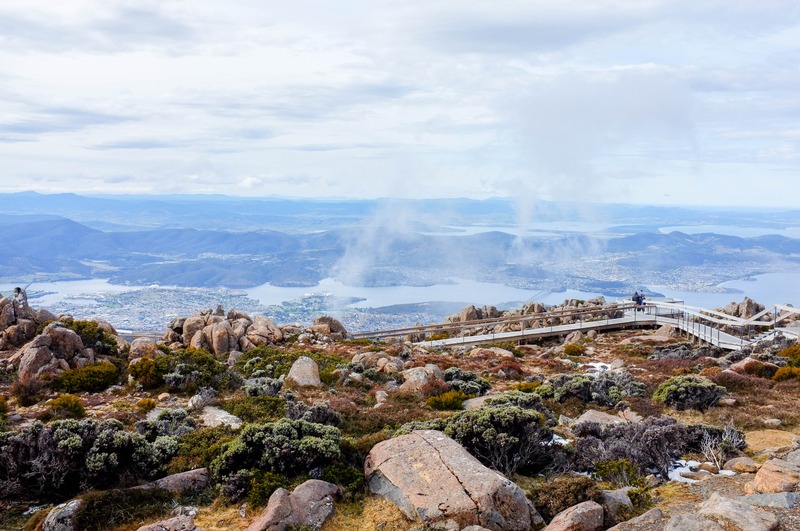 This photograph captures a breathtaking view from a mountainous peak, overlooking a sprawling landscape dotted with water bodies and distant hills. The composition highlights a winding boardwalk leading into the scene, inviting the observer to explore this serene environment bathed in soft, diffused light under a cloudy sky. The earthy tones of the rocky foreground contrast beautifully with the tranquil blues and greens of the distant vista, creating a mood that is both peaceful and contemplative.