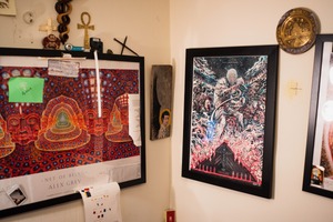 This intimate photograph captures a richly adorned wall featuring vibrant artworks, including the mystical designs of Alex Grey. The dynamic interplay of colors and forms evokes a sense of spiritual exploration, while the soft, ambient lighting enhances the contemplative mood. Surrounding the framed pieces are various artifacts, adding layers of personal narrative to the lively composition.