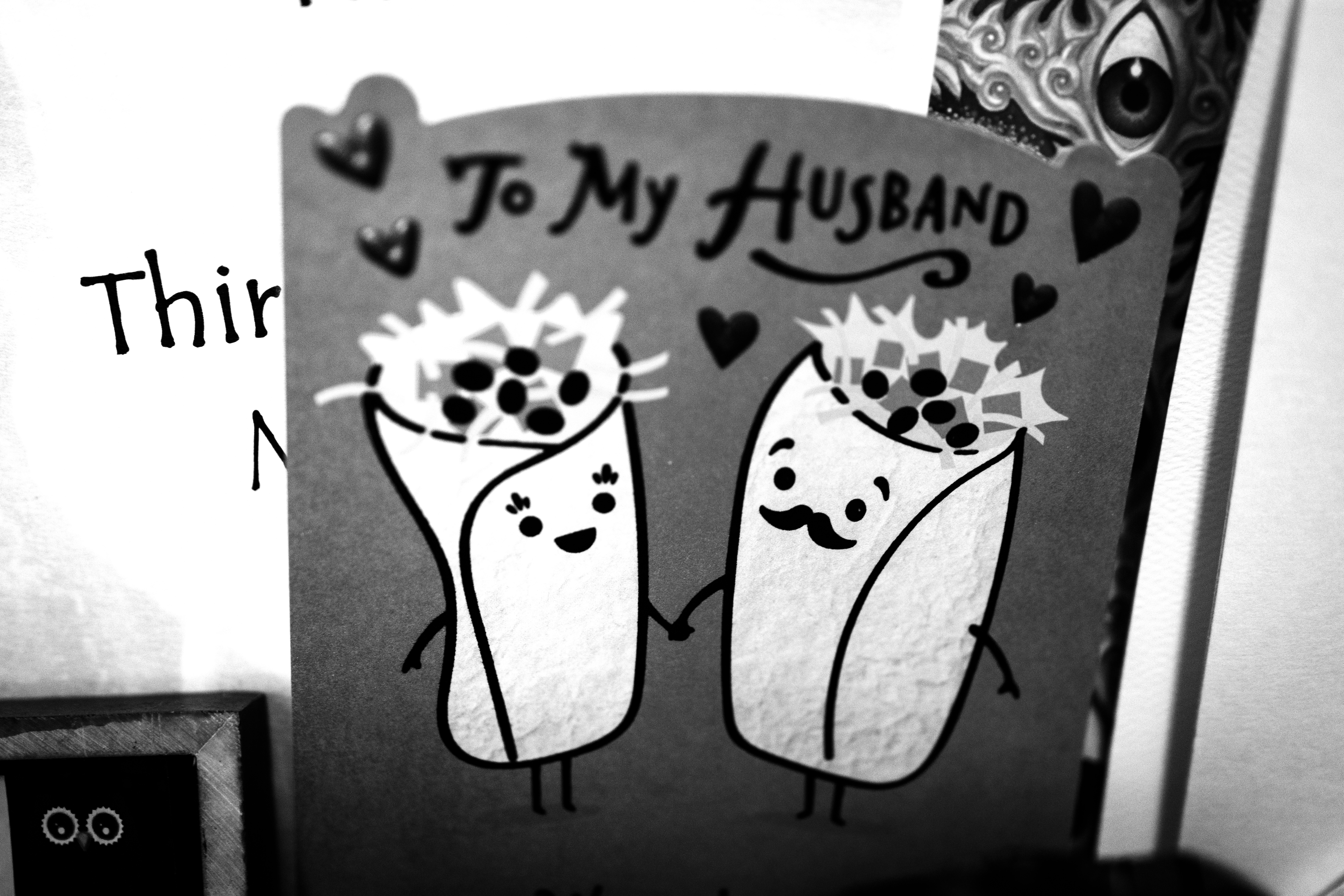 This charming black-and-white photograph features a playful greeting card depicting two cartoonish burritos holding hands, symbolizing love and affection. The light and soft focus enhance the lighthearted mood, while the handwritten text in the background adds a personal touch, suggesting a moment of intimacy and joy between partners.
