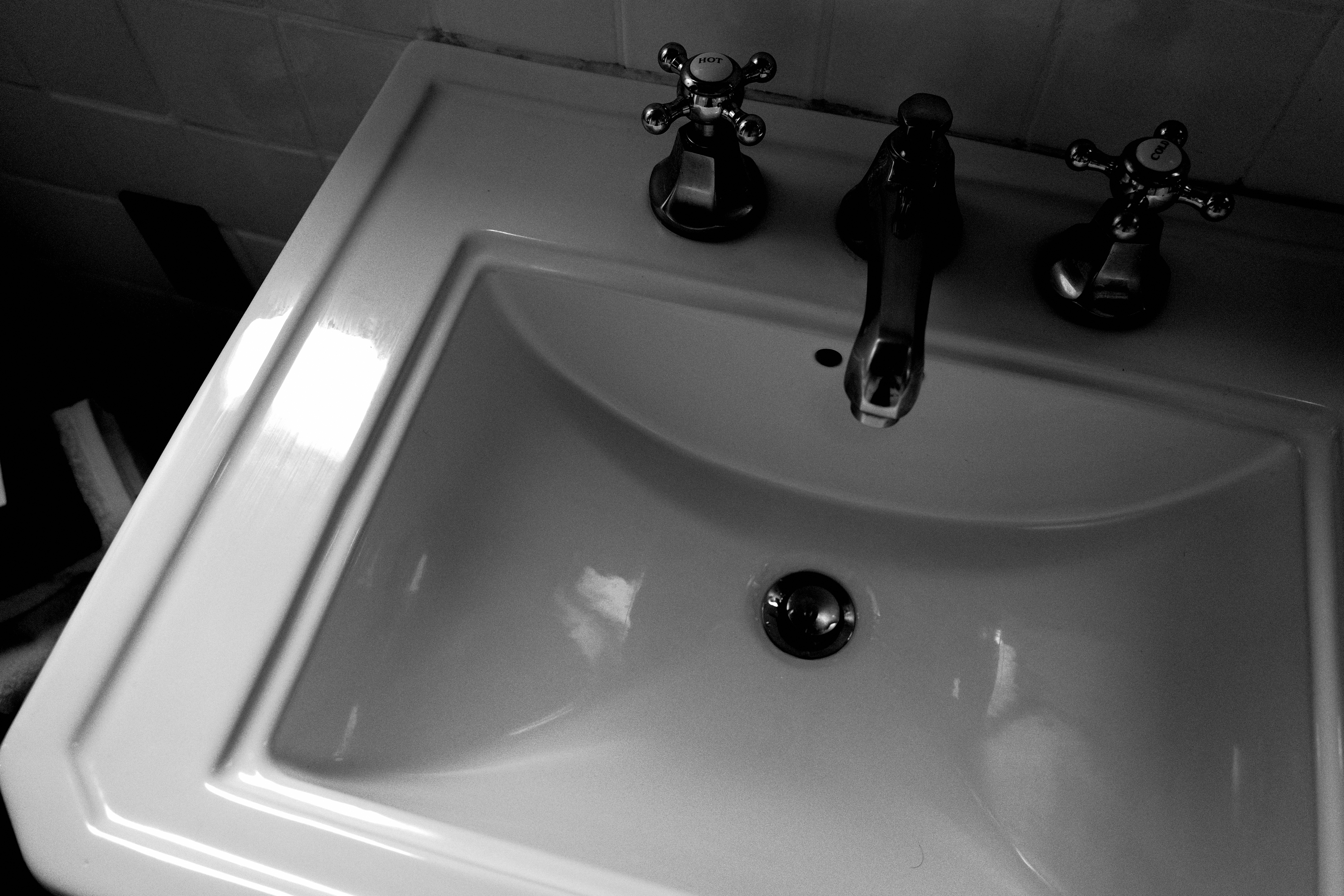 This monochromatic photograph captures a pristine bathroom sink, evoking a sense of quiet introspection. The gleaming surface reflects soft light, enhancing its sleek curves and subtle details. The composition, emphasizing the sink's symmetry and the glint of the metallic faucets, creates a mood of serene simplicity and understated elegance.