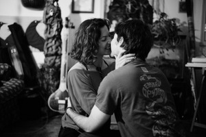 In a softly lit room, a couple shares a tender moment, their faces illuminated by gentle light that accentuates their closeness. The black and white tones enhance the intimacy, giving the scene a timeless, nostalgic feel. Their surroundings, filled with personal touches, suggest warmth and familiarity, capturing a snapshot of love and connection.