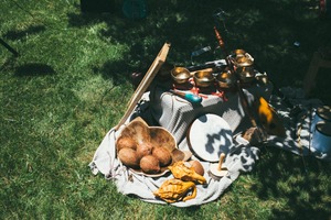 This photograph captures a serene gathering of musical instruments arranged on a textured blanket spread across lush green grass. Dappled sunlight filters through nearby foliage, casting gentle shadows and enhancing the warm, inviting atmosphere, inviting viewers to imagine the sounds and rhythms produced in this tranquil setting.
