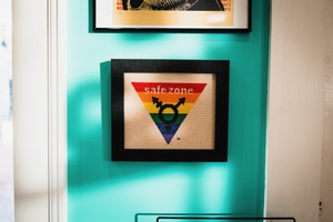 The photograph features a beautifully framed 'safe zone' emblem crafted in a vibrant rainbow triangle, symbolizing inclusivity and support for the LGBTQ+ community. The bright teal wall enhances the cheerful and welcoming mood, illuminated by soft, natural light that highlights the intricate stitching. This cozy composition invites viewers to reflect on the importance of safety and acceptance in communal spaces.