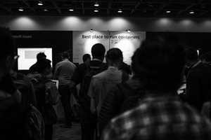 In a bustling conference setting, a crowd of people gathers in front of a display promoting cloud technology. The monochromatic tone accentuates the concentration of the attendees, whose heads are turned toward the presentation, creating a sense of collective curiosity and engagement. The soft lighting highlights the expressions of intrigue while adding an intimate atmosphere to the larger event.