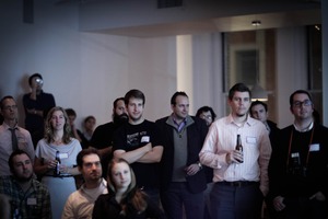 The photograph captures a diverse audience, intently focused on a speaker off-camera, with varying expressions of curiosity and engagement. Soft, diffused lighting casts a contemplative mood over the scene, enhancing the subtle emotions displayed on the faces. The composition draws the viewer’s eye across the crowd, creating a sense of unity in their shared experience.