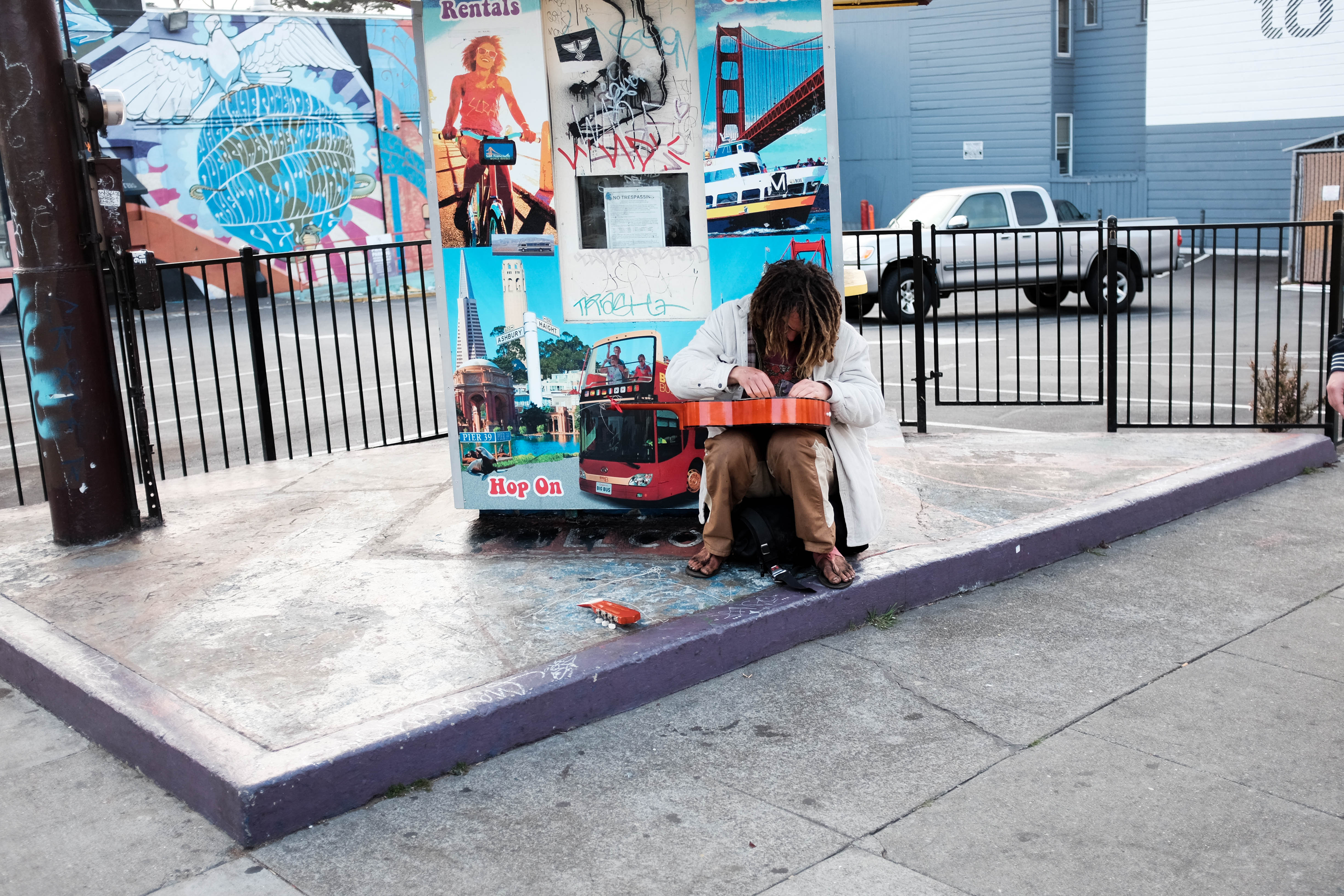 In a vibrant urban setting, a solitary figure sits on a weathered step, absorbed in their task. This poignant moment captures the contrast between the bustling surroundings and the individual's stillness, framed by colorful murals and markers of city life. The soft lighting adds a reflective mood, evoking a sense of introspection amidst the chaos of the city.