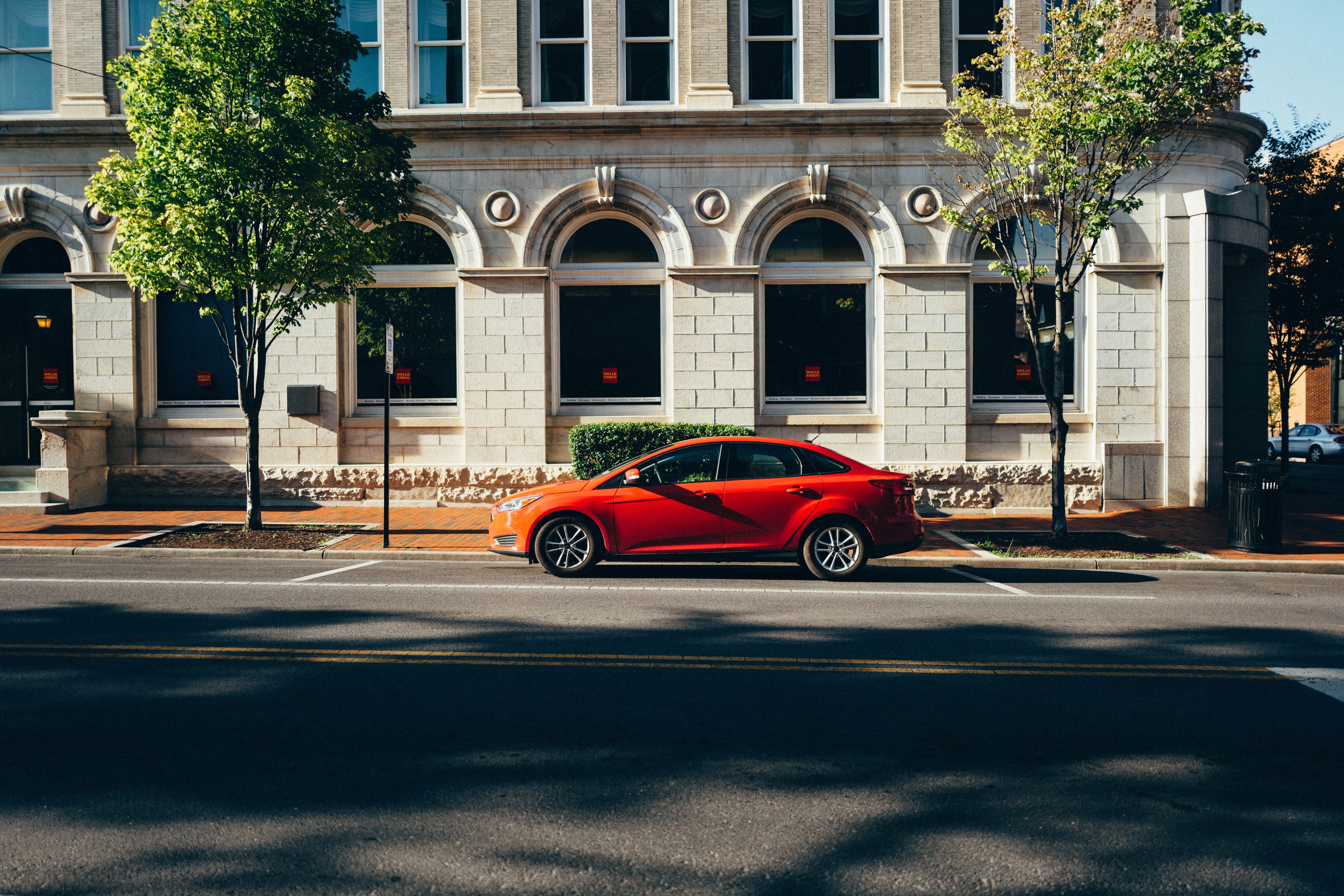 A striking red car stands out against the muted stone façade of an urban building, framed by lush green trees. The sunlight casts playful shadows, enhancing the vibrant color of the vehicle while creating a calm, inviting atmosphere. The composition emphasizes the sleek lines of the car, juxtaposed with the architectural details behind it, capturing a moment of modern life in the city.