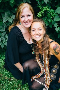 A warm moment captured between two women, one standing and the other seated, radiates joy and connection against a lush green backdrop. The soft, diffused lighting highlights their cheerful expressions, evoking a sense of love and nostalgia. Their contrasting styles and accessories symbolize individuality while enhancing their bond, creating an inviting and heartfelt atmosphere.